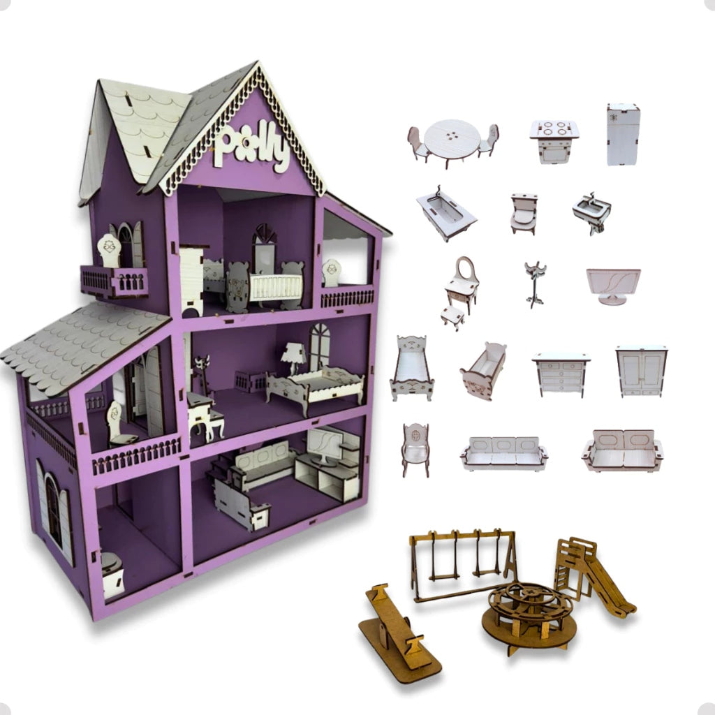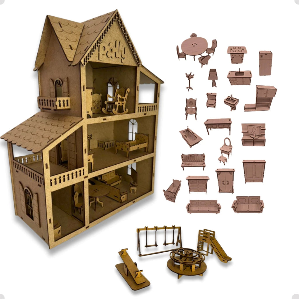 Com três andares e três varandas, essa Casinha de Boneca em MDF – 19 Móveis e Parquinho Infantil Completo oferece um cenário completo para a imaginação ganhar vida.