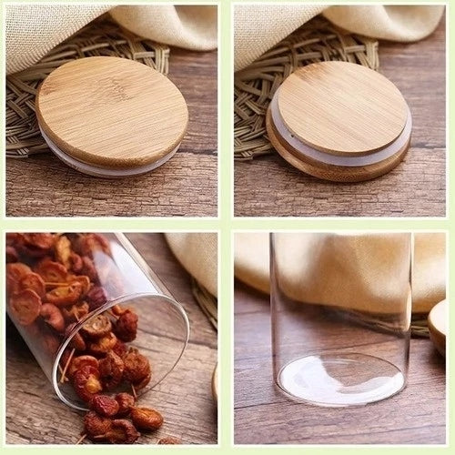 As tampas de bambu adicionam um toque natural e elegante, combinando beleza e sustentabilidade, enquanto o acabamento redondo traz charme e praticidade ao conjunto.